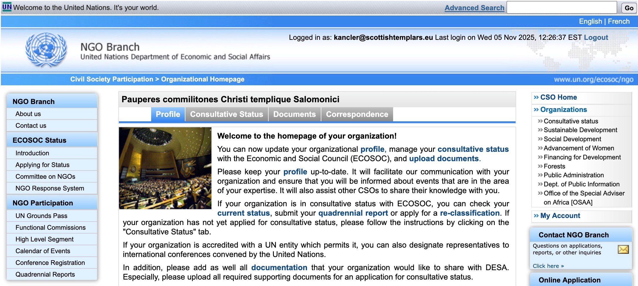The Knight Order and Registered Association Pauperes commilitones Christi templique Salomonici has been officially accepted by the United Nations Department of Economic and Social Affairs (UN DESA).